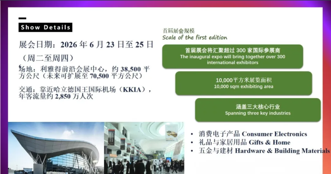 首届展会将精准聚焦电子、家居礼品及五金三大高增长领域,规划面积达 10,000 平方米,预计吸引超过 400 家亚洲优质供应商参展,旨在为中国及其他亚洲供应商搭建一座通往沙特乃至整个中东市场的专业 B2B 贸易桥梁。